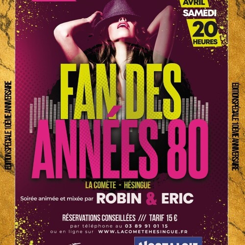 Afficher le planC'est le retour de la traditionnelle soirée Fan des années 80 organisée par l'US Hésingue! Souvent imitées, jamais égalée! Pour cette édition 10ème anniversaire, venez vous déhancher sur les tubes des années 80 mixés par Robin et Eric jusqu'au bout de la nuit!